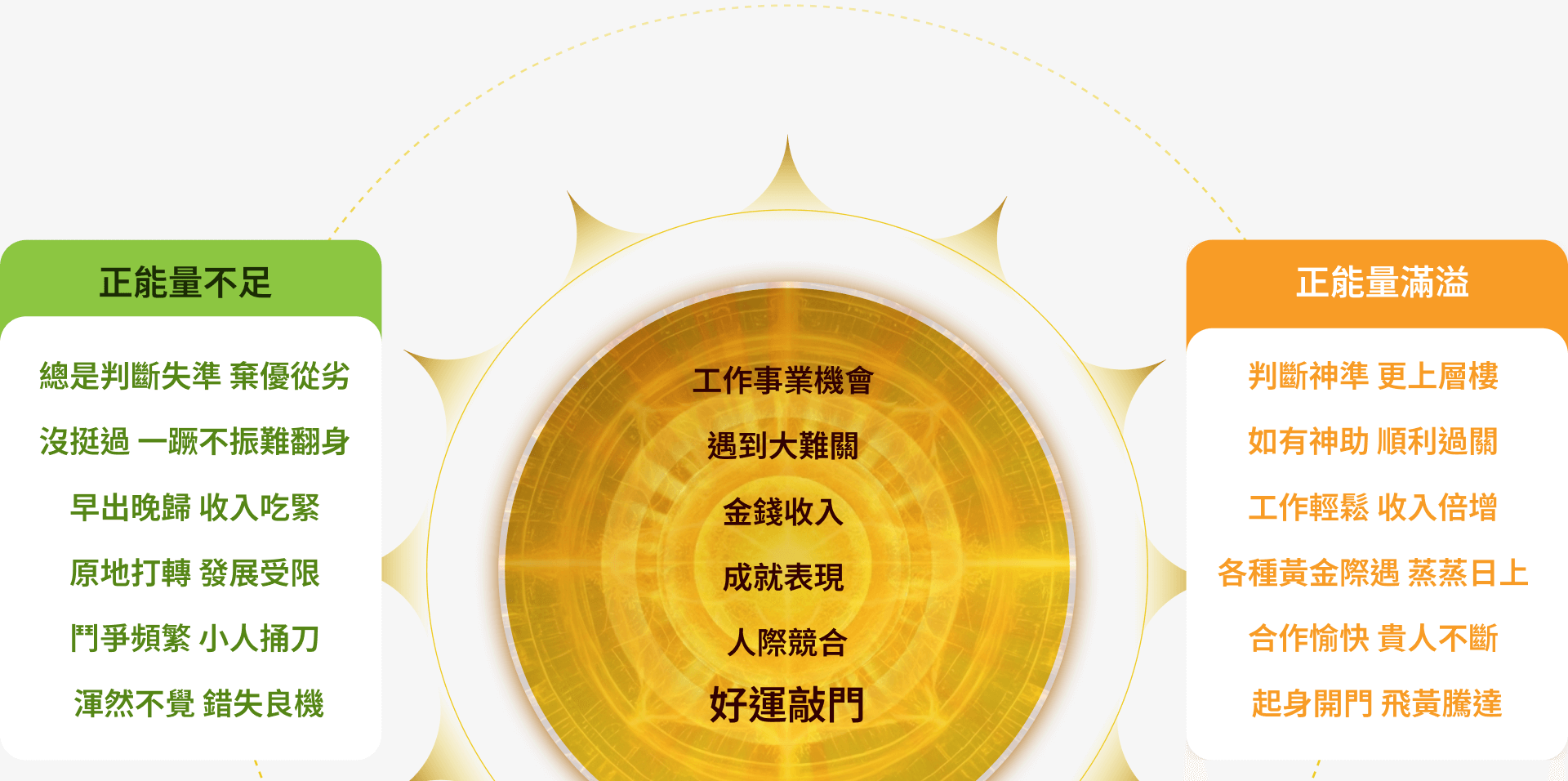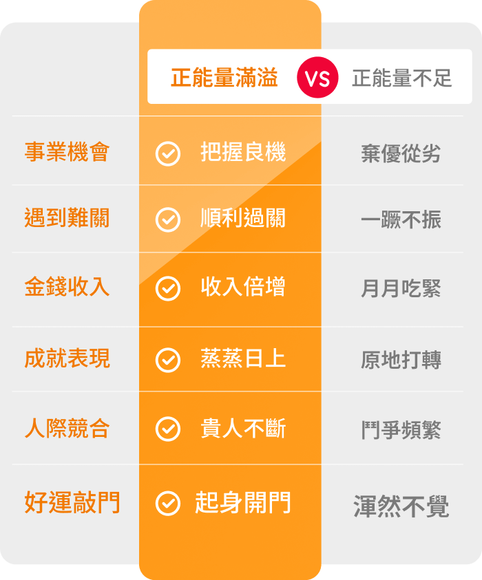 當你透過我們有效的方法和步驟,與宇宙天地產生連結,能確實調理、平衡你的身心靈正負能量,吸引力法則才會開始啟動。若只做吸引力法則,可能會因遲遲不成功導致內心錯亂,或雖然吸引到大量好運,卻因能量場不匹配,沖走你原來的正能量場,若你負荷不了,反而成了災難的開始,例如:財務出現漏洞、病痛纏身、家庭失和等問題。
