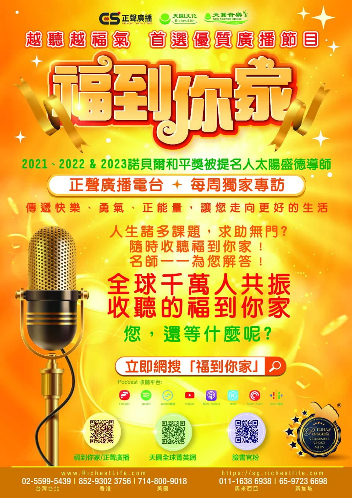 「福到你家」 是太陽盛德導師與正聲廣播電台的訪談節目,內容豐富包括: