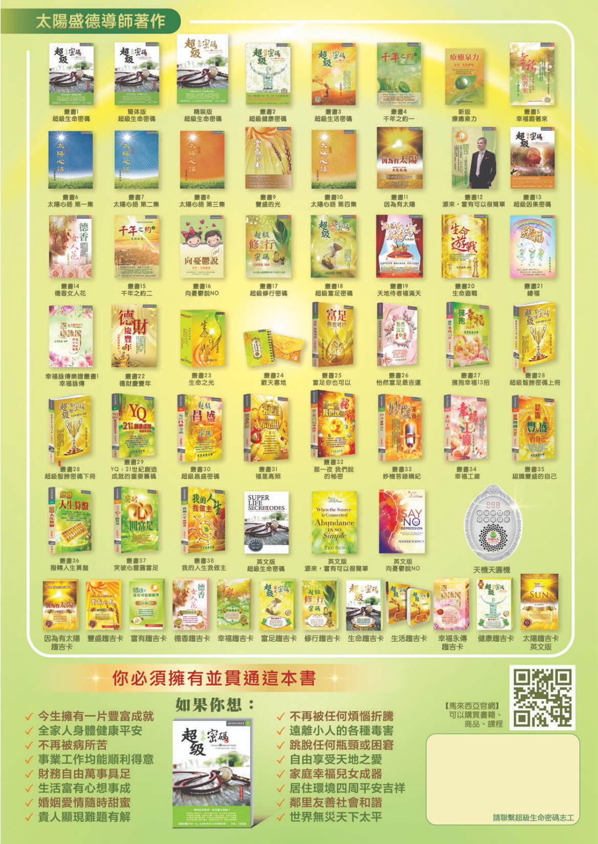太陽盛德導師創作超過80首動人正能量歌曲,曲曲觸動心弦,在Youtube上的點閱無數,廣傳於美國、香港、馬來西亞、台灣、中國、澳洲、歐洲、東南亞等地。