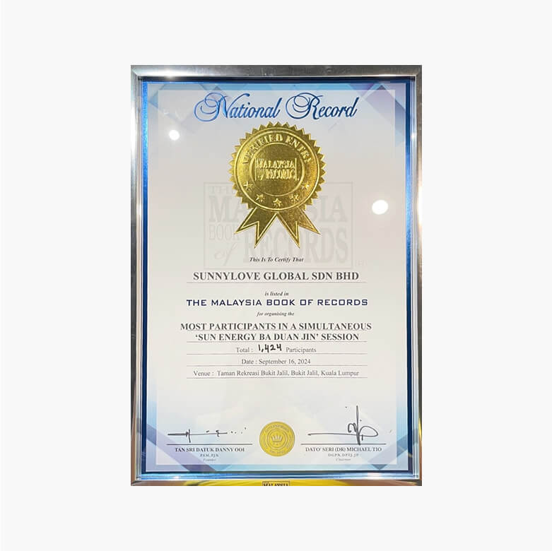 太陽八段錦 每天只要10分鐘,驅走負能量、增加正能量!讓好運來敲門的古老智慧功法! 融合百年智慧與太陽能量的身心養生瑰寶 身體運好氣,天天都有正能量好運氣! 太陽八段錦是一套融合傳統智慧與太陽能量的養生功法。以流傳八百餘年的傳統八段錦為基礎,源自北宋《易筋經》「千八攢」的動作精髓,由八段簡易招式組成。經太陽盛德導師改良融入太陽的能量後,此功法不僅承襲傳統八段錦強身健體的特色,更幫助練習者在舒展筋骨的同時,獲得更深層的身心靈調適與正能量提升,是結合古老智慧與現代需求的養生良方。 適合哪些族群? 3C低頭族 辦公室久坐上班族 熬夜念書學生族 易勞累疲倦者 焦躁易怒者 中高齡長時間居家者 全球學員好評不斷 活動紀念表彰 2024 年 9 月 16 日馬來西亞超大型活動 該場次於北馬、中馬、南馬、東馬,同時達1,424人共同進行太陽八段錦 媒體報導 媒體報導 關於太陽盛德導師 天圓文化身心靈成長機構創辦人 全球超級生命密碼系統精神導師 2021 ~ 2023年連續三年被提名諾貝爾和平獎榮獲美國國會議員Susie Lee、美國國會議員Ted Lieu、內華達州前州長Steve Sisolak及內華達州議員Rochelle T. Nguyen頒發榮譽獎狀天圓文化榮獲馬來西亞國家消費人行動議會頒發【2023年消費人認證品牌大獎Consumers’ Choice Award (CCA)】獎項 首頁 全球免費學習資源 太陽八段錦