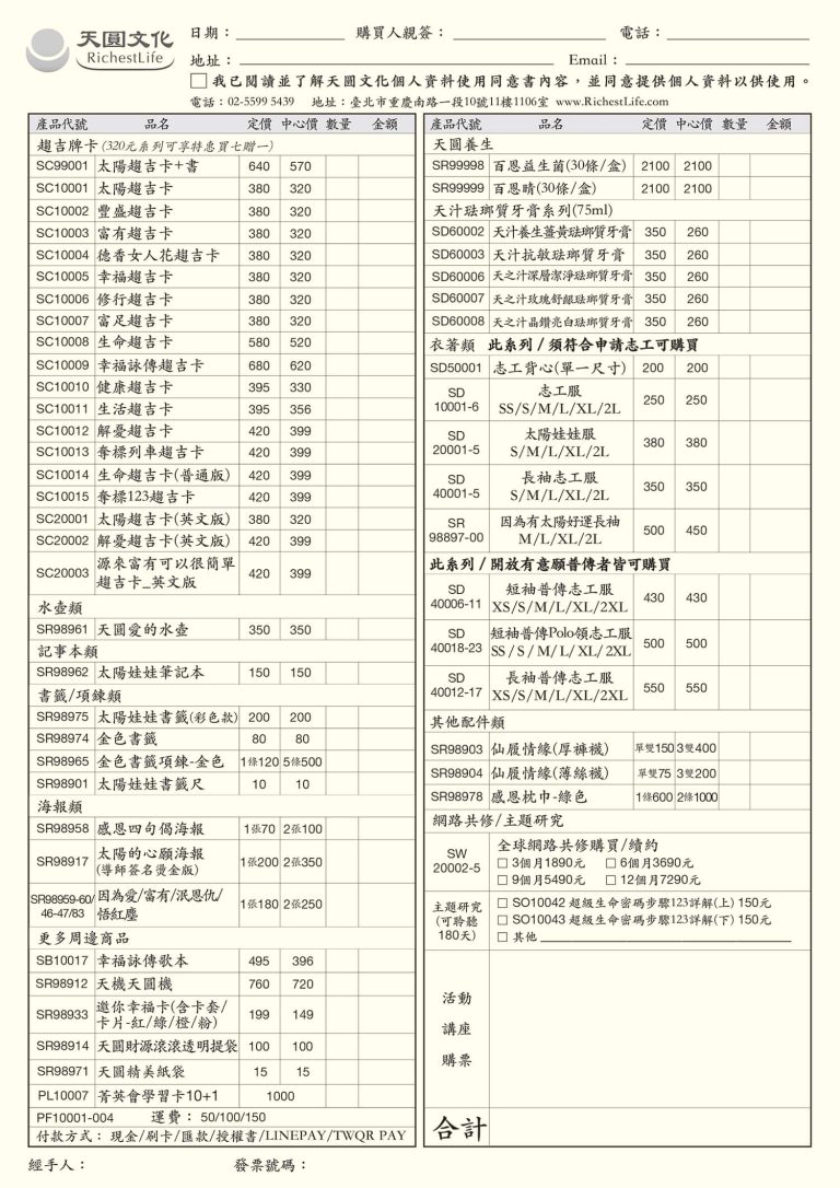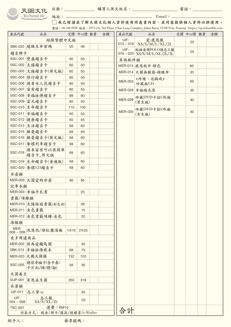訂購單查詢/下載 提供實體中心書籍/商品現場訂購單 書籍訂購單(台灣) 點圖可放大查看及下載 商品訂購單(台灣) 點圖可放大查看及下載 書籍訂購單(馬來西亞) 點圖可放大查看及下載 商品訂購單(馬來西亞) 點圖可放大查看及下載 首頁 訂購單查詢/下載